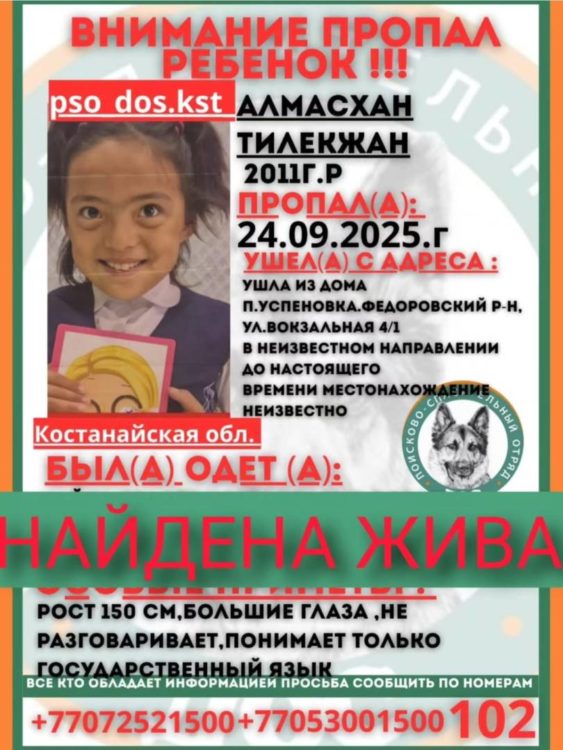 В Костанайской области завершились масштабные поиски пропавшей 14-летней девочки с особенностями развития, сообщает пресс-служба департамента полиции региона.