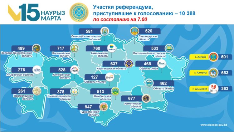По состоянию на 7.00 часов 15 марта, в регионах все 10 388 участков приступили к голосованию. На 92 участках, согласно принятым решениям территориальных комиссий, голосование началось в 6.00 часов утра.