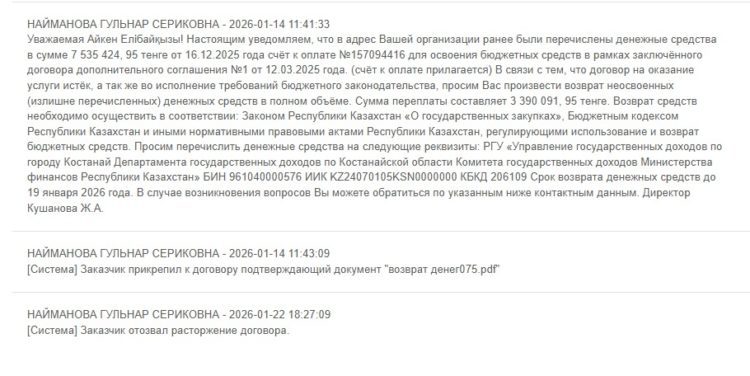 Директор школы Ж. Ерденова трижды писала запросы: «Почему кассовые операции идут от другого юрлица? Это признак незаконной передачи обязательств!» Поставщик запросы игнорировал.