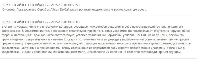 Из претензии директора школы Ж. Кушановой: «03 декабря 2025 года при подаче полдника детям из мини-центра выяснилось, что в вафлях обнаружены черви. Бракеражная комиссия незамедлительно забраковала 6,5 кг продукции».