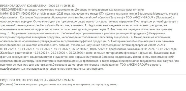 Только 11 февраля 2026 года гимназия им. Момышулы официально заявила о расторжении договора в одностороннем порядке, сославшись на недостоверные сведения о кадрах и фактическую передачу бизнеса в субподряд.