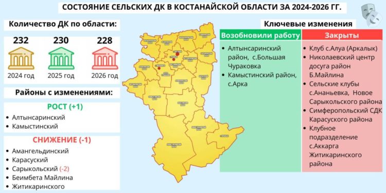 Формально спад не выглядит критичным, но за ним скрываются конкретные населенные пункты, где клубы уже закрылись или перестали работать. В официальных данных указано, что за этот период были закрыты шесть учреждений. Среди них — клубное подразделение в селе Алуа Аркалыка, Николаевский центр досуга в районе Беимбета Майлина, клубы в селах Ананьевка и Новое Сарыкольского района, Симферопольский СДК Карасуского района и клубное подразделение в селе Аккарга Житикаринского района.
