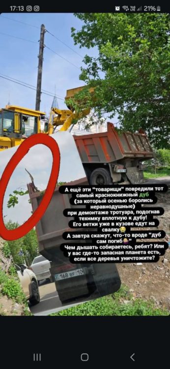 — Эти «товарищи» повредили тот самый краснокнижный дуб (за который осенью боролись неравнодушные) при демонтаже тротуара, подогнав технику вплотную к дубу! Его ветки уже в кузове едут на свалку! А завтра скажут что-то вроде: «Дуб сам погиб». Чем дышать собираетесь, ребят? Или у вас где-то запасная планета есть, если все деревья уничтожите? — писали люди в соцсетях.