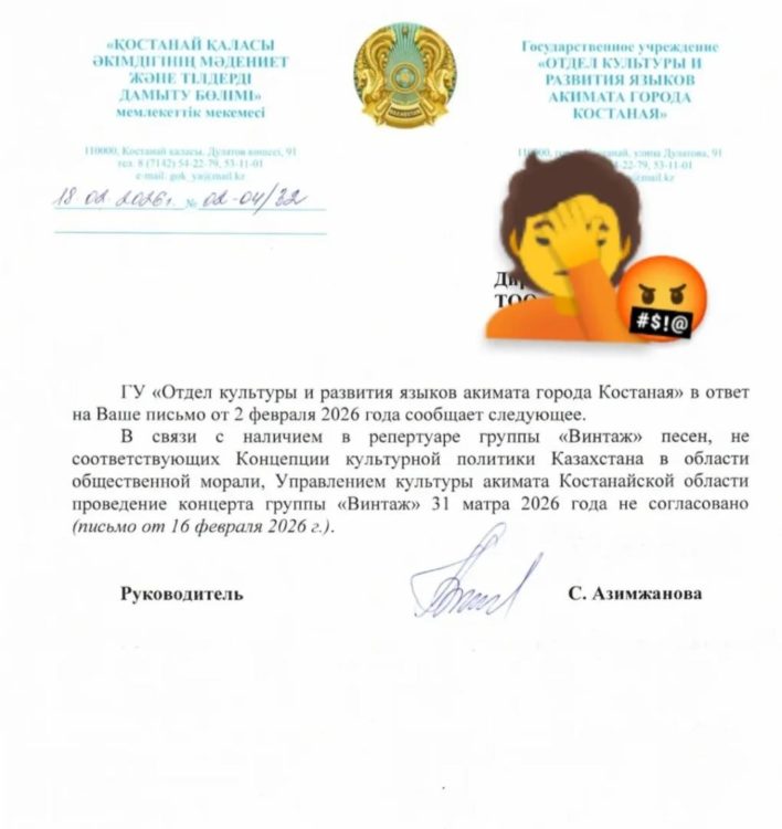 — Отдел культуры и развития языков акимата города Костаная в ответ на ваше письмо от 2 февраля 2026 года сообщает следующее: в связи с наличием в репертуаре группы «Винтаж» песен, не соответствующих Концепции культурной политики Казахстана в области общественной морали, управлением культуры акимата Костанайской области проведение концерта группы «Винтаж» 31 марта 2026 года не согласовано (письмо от 16 февраля 2026 г.), — сказано в ответе.