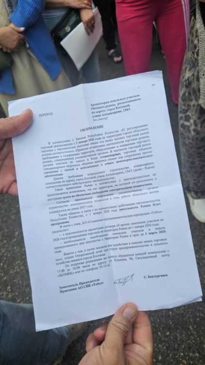 Около недели назад торговцы начали получать уведомления от собственника рынка — СПК «Тобол», в котором указано: «приведение рынка в соответствие с законодательством не представляется возможным, так как территория, на которой он расположен, в настоящее время не обеспечена свободными электрическими мощностями».