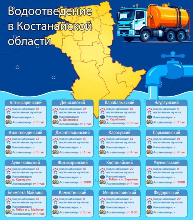 Иная картина — в Костанайском районе. Здесь канализация есть в двух населенных пунктах — г. Тобыле и с. Заречном — ввиду густонаселенности, а также наличия большого количества многоэтажной застройки.