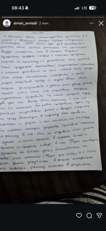 В социальных сетях в эти дни родители учеников школы-гимназии им. Б. Момышулы (№5) пересылают друг другу жалобу, написанную от имени Юлии Вяткиной, бывшего пекаря, работавшего с поставщиком питания ТОО «Айкен Груп».