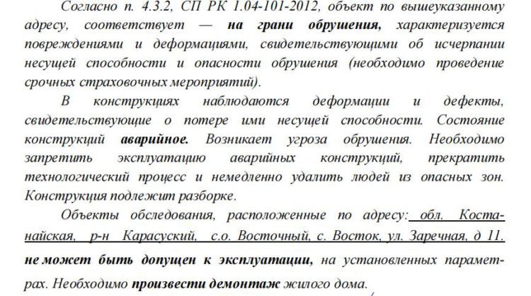 Женщина ходила в акимат за помощью, где ей посоветовали сделать независимую экспертизу и сразу порекомендовали фирму. Так Наталья Хамилова обратилась в ТОО «Qazlife» (Темиртау) и отдала за их работу 80 тысяч. Результат технического обследования — 5 степень аварийности жилья с немедленной эвакуацией. Дом признан не пригодным для проживания и находится на грани обрушения. Все строительные конструкции дома эксперты назвали неудовлетворительными. Также были выявлены повреждения и деформации, свидетельствующие о снижении несущей способности стен и перекрытия.