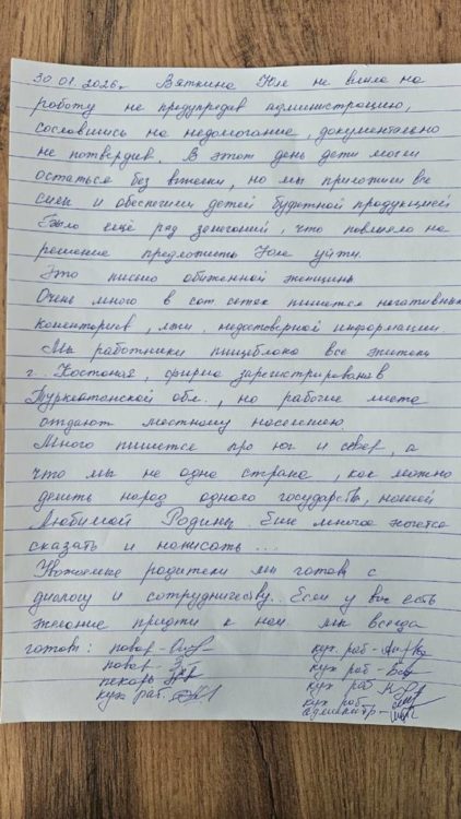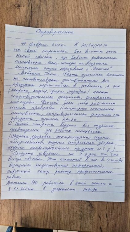 Кстати, сотрудники пищеблока написали опровержение. Показали его Юлие Ким, чтобы та сфотографировала и передала другим родителям.